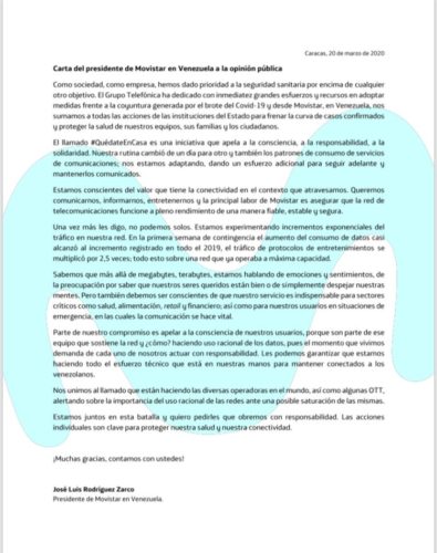 Carta del Presidente de Movistar en Venezuela a la opinión pública Tecnología marzo 20, 2020 0 Compártelo: 0 Shares 0 More ”Estamos juntos en esta batalla” Compártelo: 0 Shares 0 More Entrada anterior BENAVIDES SE CONFIESA: “ELLA ME DICE NO” Entrada siguiente PSICÓLOGOS LLAMAN A LA CALMA ANTE LA LLEGADA DEL CORONAVIRUS Ana Teresa Delgado de Marin También puedes leer abril 17, 2026abril 17, 2026 0 ¡LA FIESTA DEL FÚTBOL SE VIVE EN CASA CON LG QNED73, DISEÑADA PARA UNA EXPERIENCIA INMERSIVA! abril 15, 2026 0 Movistar supera 160 estaciones activas con tecnología 5G en el país abril 14, 2026 0 Galaxy S26 Ultra se corona como el mejor smartphone del año, según Consumer Reports Deja una respuesta Cancelar la respuestaTu dirección de correo electrónico no será publicada. Los campos obligatorios están marcados con *Comentario * Nombre * Correo electrónico * Web Guarda mi nombre, correo electrónico y web en este navegador para la próxima vez que comente. Δ