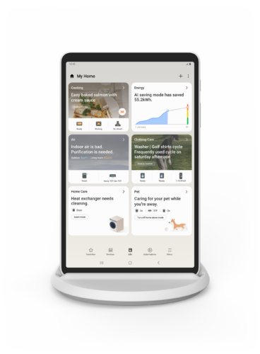 Por primera vez, se ha unido una amplia gama de servicios SmartThings personalizados y basados en IA y pueden controlarse desde un dispositivo dedicado con Samsung Home Hub. Estos servicios de SmartThings se incluyen en las categorías de Cocina, Cuidado de la ropa, Mascotas, Aire, Energía y Asistente para el cuidado del hogar (Cooking, Clothing Care, Pet, Air, Energy e Home Care Wizard).