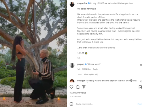 Cuando el cantante de Bad Things se arrodilló para proponerle matrimonio a su amada, los fanáticos bombardearon la sección de comentarios de la publicación con mensajes llenos de amor.