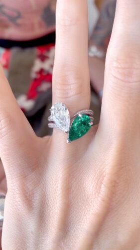 Dejando caer una fotografía de primer plano del anillo, escribió: “Lo diseñé con Stephen Webster para que fueran dos: la esmeralda (su piedra de nacimiento) y el diamante (mi piedra de nacimiento) engastados en dos bandas magnéticas de espinas que se juntan como dos mitades de una misma alma formando el oscuro corazón que es nuestro amor.”