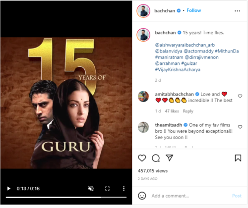 El lanzamiento de 2007 Guru fue la película que encendió el amor entre Abhishek y Aishwarya. Le había propuesto matrimonio a su ahora esposa en los sets de filmación, usando un anillo de utilería.