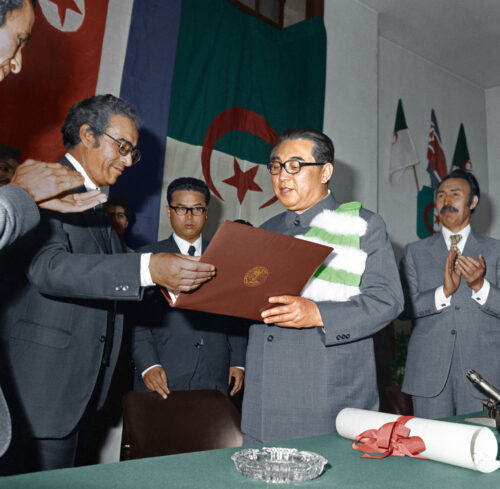 Recibe de Rashid Touri, rector de la Universidad de Algiers de Argelia, la cinta y el diploma de Doctor Honoris Causa, mayo de 1975