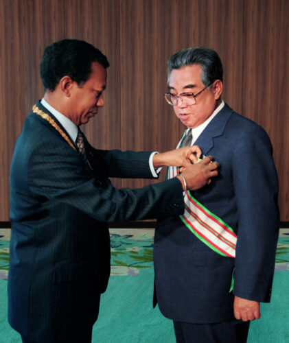 La preeminencia y la autoridad del político coreano quien no hizo distinción alguna de ideologías, criterios políticos, creencias, sistemas sociales, idiomas y fronteras se concretan en las condecoraciones, títulos honoríficos y regalos entregados a él por numerosos países y organismos internacionales.
