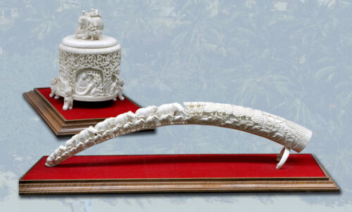 Caravana de elefantes, caja de tabaco y escultura en marfil regalada por un comerciante birmano, abril de 1980