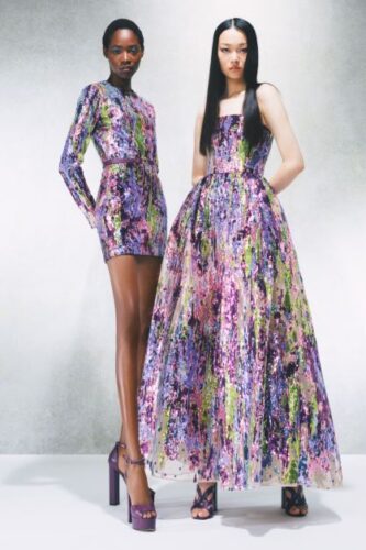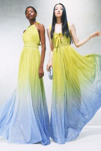 Explosiones audaces de colores, volúmenes aventureros y texturas seguras se unen en una diversidad de siluetas que dejan una impresión impactante. El rojo cardenal, el azul noche, el vino de uva, la lima y la lavanda envalentonan los vestidos de seda largos y sueltos por excelencia de ELIE SAAB. En juegos sensuales de poder y romance, el cuero gráfico seduce al cuerpo en interpretaciones de una chaqueta y una falda, mientras que los remolinos hipnóticos inspirados en la lima y el vino de los años 70s realzan los looks que abrazan la figura. La opulencia y la grandeza se desbordan en algo más que un mero adorno, con atrevidos cuellos halter de metal geométrico y correas posteriores de cristal que mantienen unidas las líneas de crepé.