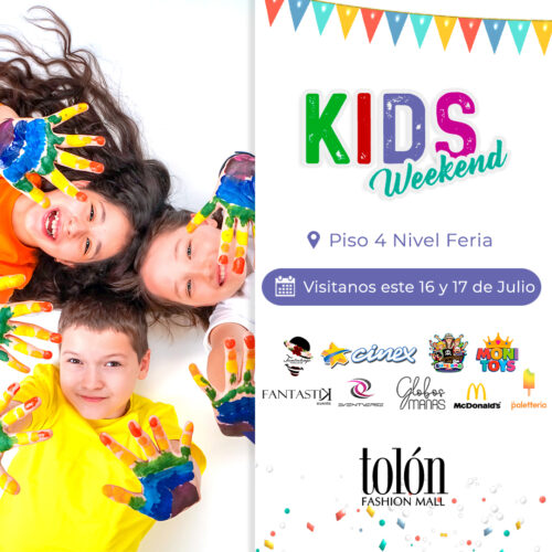 El sábado 16 y domingo 17 de julio es la gran fiesta para los niños con KIDS WEEKEND, con actividades a partir de las 2:00 de la tarde en el piso 4, nivel Feria con: globomagia, pintacaritas, show de las princesas, estaciones interactivas, personajes, show de magia, rifas y muchas sorpresas que Tolón y sus aliados comerciales tendrán para los niños.
