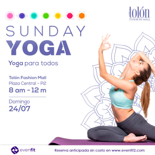 El domingo 24 de julio, continuando con la variada programación, será el SUNDAY YOGA, un evento que por primera vez realiza el mall, dedicando una mañana completa a los amantes de esta disciplina; la programación incluye clases prácticas de Yoga Pranayama y Meditación, Neuro Yoga, Yoga Strech, Hatha Ypoga y Yoga en Pareja dictadas por los especialistas Carolina Sanabria, Amadeo Porras, Joaly Padilla y Ricardo Sosa. Es un evento organizado por Tolón de la mano del aliado y productor deportivo Evenfit @evenfit2. La cita es en el Piso 2, Plaza Central desde las 8:00 a.m. hasta las 12:00 p.m., los interesados en participar pueden reservar su cupo a través de la página web www.evenfit2.com.