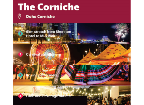 La principal oferta de entretenimiento del país durante la Copa Mundial de la FIFA será Doha Corniche, que tendrá un ambiente de carnaval a lo largo de su ruta de 6 km, que se extiende desde el Sheraton Grand Doha hasta el Museo del Parque de Arte Islámico. Contará con espectáculos itinerantes, actividades culturales, puestos de comida y bebida y puntos de venta. Más de 120.000 personas podrán visitar la Corniche en hora punta.