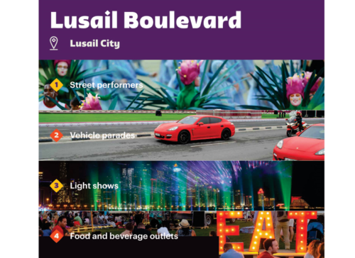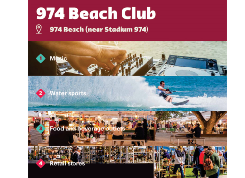 Otro punto de acceso turístico será el 974 Beach Club, ubicado cerca del 974 Stadium, que ofrecerá música, actividades, opciones de alimentos y bebidas y puestos de venta minorista para hasta 10,000 invitados. Lusail Boulevard, ubicado cerca del estadio que albergará la final de la Copa Mundial de la FIFA, albergará espectáculos callejeros para unas 50.000 personas todos los días.