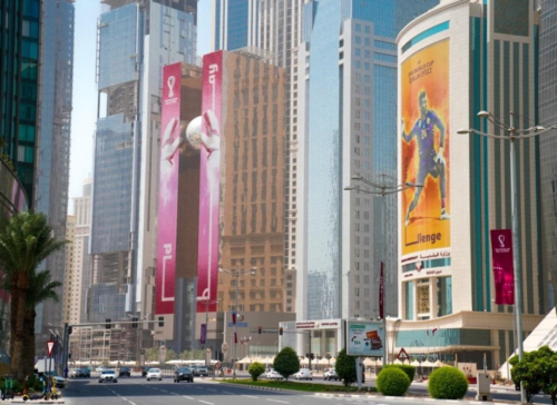 Las calles de Doha y sus edificios están bellamente decoradas con colores brillantes, eslóganes y letreros de bienvenida pintados en las fachadas de las torres en el área de Dafna y en todo el país.