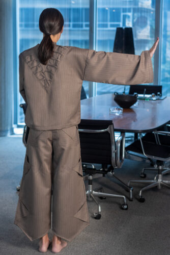 “En este caso, es diseñar una ropa que te va a dar identidad, con cortes uniformes y con capas que buscan la estética. Los cortes y la textura que usamos crean ese efecto de luminosidad, que también se consigue con la caída de la tela”, destaca.