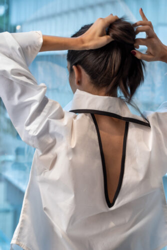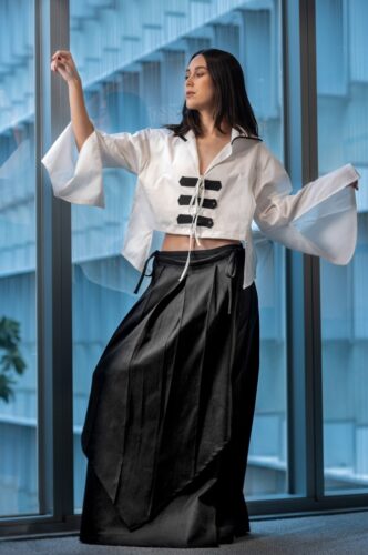 Del país asiático también toma la técnica milenaria Furoshiki, utilizada para envolver regalos de forma sostenible con tejidos reutilizables como la seda, el poliéster o el algodón. Una propuesta que se relaciona con el upcycling y que incluso extiende más allá de la prenda de vestir, pues los empaques de los modelos de su colección son con este tipo de envoltura.