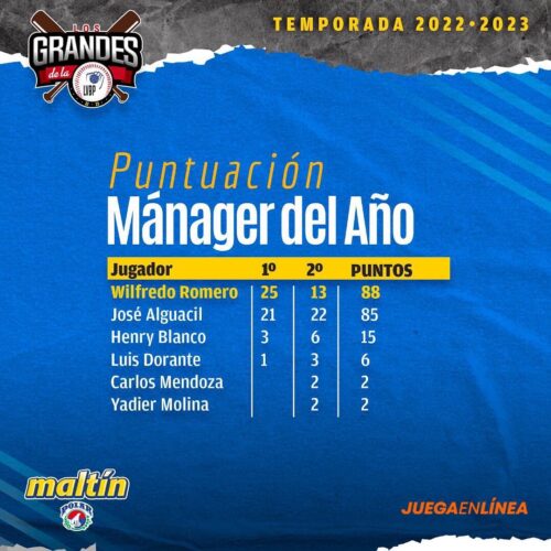 Precisamente Dorante, quien finalizó en el cuarto puesto en esta elección, y el propio Pedrique son los estrategas con más galardones al Mánager del Año con tres cada uno, por lo que Romero se colocó a uno de igualarlos en apenas su segunda campaña como piloto en Venezuela.