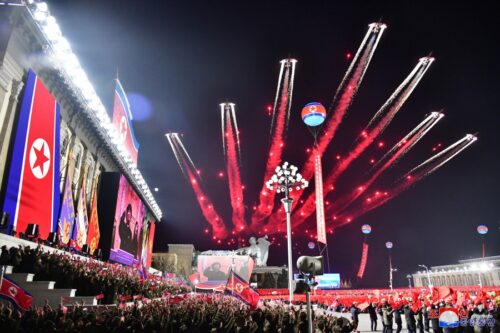 Estallaron en ese instante las estruendosas vivas y los gritos de «Kim Jong Un» y «Defensa a ultranza» que pronunciaban todos los efectivos de la parada y participantes en los festejos hacia el gran General Insigne quien con su extraordinaria estrategia militar y destacada arte de mando, escribió la nueva página de ascenso de las fuerzas armadas revolucionarias y de incremento del potencial militar e inspiró la convicción del futuro maravilloso de la potencia del Juche.