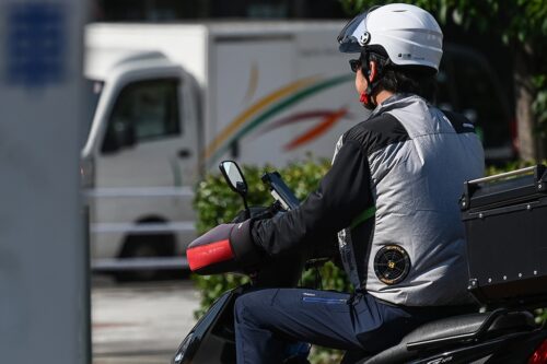 Esta foto muestra a un hombre que usa una chaqueta con ventiladores incorporados que funcionan con baterías para mantenerse fresco en el calor mientras se sienta en su scooter a lo largo de una calle de Tokio.