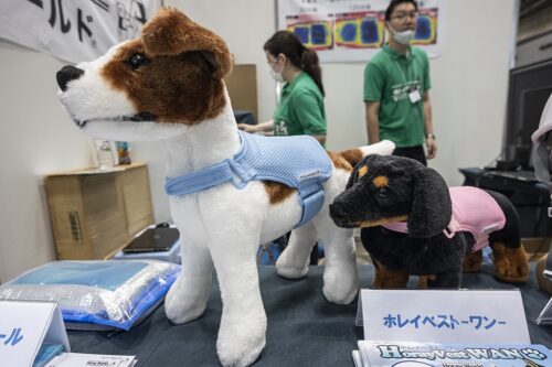 Esta foto muestra juguetes de peluche vestidos con paquetes de refrigeración Horay Vest Wan especialmente diseñados para perros por Horay World, durante la ‘Exposición de contramedidas contra el calor extremo de Tokio’.