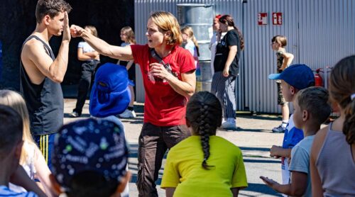 La especialista Katja Pickbrenner y un colega enseñan a representar una escena de pelea en el taller de especialistas para niños.