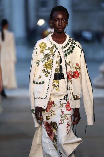 Union Jack y palacio inglés El diseñador Erdem Moralioglu, nacido en Montreal, organizó su espectáculo bajo la columnata del Museo Británico, creando una atmósfera majestuosa desde el principio. Para su colección primavera-verano 2024, profundizó en los archivos del Palacio de Chatsworth, la casa de los duques de Devonshire en el norte de Inglaterra. Erdem creó una colección poética, con estampas basadas en grabados y tapices de Chatsworth. Las faldas y vestidos de organza y raso eran largos, con los hombros descubiertos, como los de una princesa de cuento de hadas.