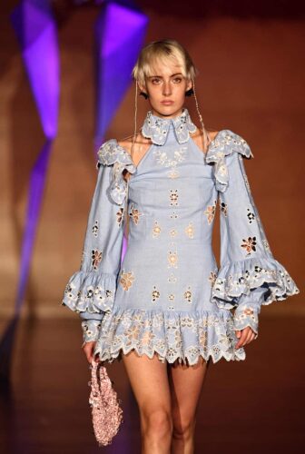 Los diseñadores pueden encontrar fuentes de inspiración en lugares inesperados, como lo demuestran las pasarelas de la Semana de la Moda de Londres el domingo. La diseñadora ucraniana Masha Popova recurrió a los espectáculos de camiones monstruo, mientras que la china Susan Fang mostró una colección de vestidos etéreos. Motores rugiendo Mejor conocida por su trabajo con mezclilla, la diseñadora nacida en Ucrania Popova continuó lo que ella llamó su “obsesión por la manipulación de la mezclilla” en su nueva colección. Las modelos caminaron por la pasarela con minifaldas de mezclilla y jeans de talle bajo que se ajustaban a las caderas.