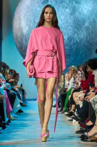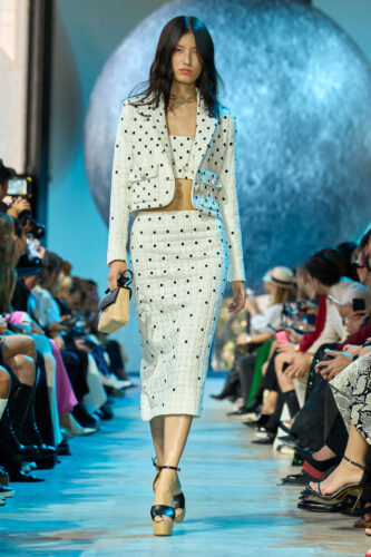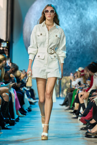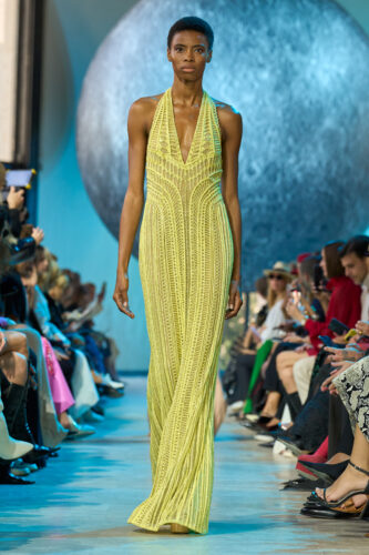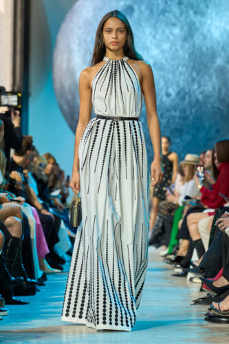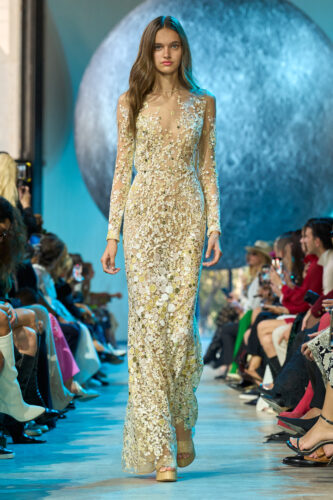 La mujer incandescente de ELIE SAAB siempre está lista para las reuniones a la luz de la luna con looks radiantes de día que aportan maravillosos destellos a la noche. Los vestidos de verano fluidos con espalda abierta y dobladillos festoneados son frescos y están confeccionados en encaje inglés blanco de gran tamaño. Mechones de flores de organza cítrica florecen en los dobladillos monocromáticos de las ondulantes chaquetas bomber de seda. Gruesos zafiros tromp-l’oeil, rubíes y cadenas de platino trazan un caftán blanco con una elegante capa. Tomas de cuentas de Spritz y Gin Blue caen en cascada de forma simétrica abrazando vestidos con divertidos cortes geométricos. Por supuesto, una fiesta nunca está completa sin plataformas de piel de rafia, minibolsos con asa superior y joyas extravagantes con piedras preciosas.