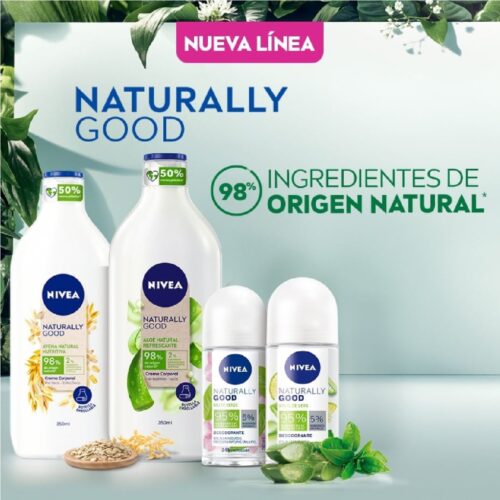 La nueva línea NIVEA Naturally Good cuenta con dos cremas corporales (disponibles en presentaciones de 200 ml y 350 ml) y dos desodorantes: