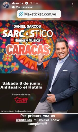 El reconocido hombre de televisión, Daniel Sarcos, arranca con su nuevo espectáculo «Sarcástico, humor y música» en Venezuela, donde los fanáticos podrán disfrutar del talento de este maracucho que, a fuerza de trabajo y profesionalismo, es considerado como uno de los animadores más importantes de la televisión, no solo en Venezuela sino, en República Dominicana y los Estados Unidos.