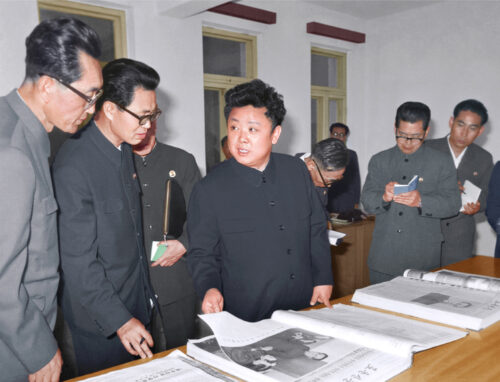 Kim Jong Il revisando Rodong Sinmun, órgano del CC del Partido, abril de 1978