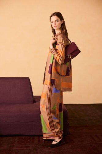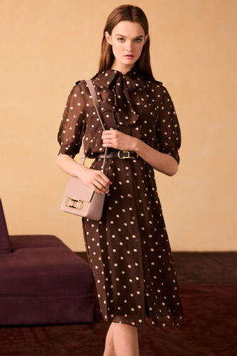 La colección Prefall de CH Carolina Herrera se ilumina con tonos naranja, burdeos y tierra, característicos de la estación, en diversas tonalidades. Estos colores reflejan la esencia del cambio de temporada y se mezclan con toques brillantes en lima y amarillo. En esta línea, se destaca el uso de los polka dots, sello distintivo de la Casa.