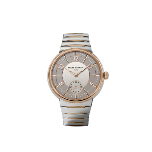 Créditos: Reloj Tambour con caja y brazalete de acero y oro, 40mm de diámetro, movimiento mecánico automático LFT023, por Louis Vuitton Watchmaking.