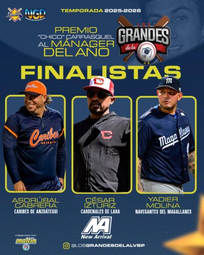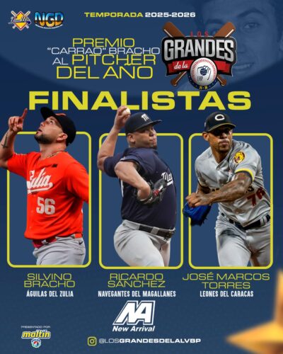 Los Grandes de la LVBP ya completaron sus cuadros de finalistas de la temporada 20252026, auspiciados por New Arrival, con el anuncio de las ternas para los Premios “Carrao” Bracho al Pitcher del Año, “Chico” Carrasquel al Mánager del Año y Víctor Davalillo al Jugador Más Valioso.
